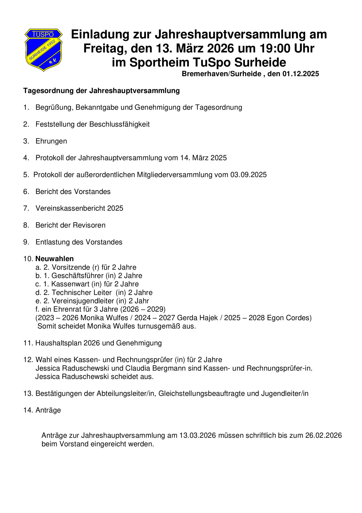 Einladung zur Jahreshauptversammlung der Fußballabteilung des TuSpo Surheide e. V.
